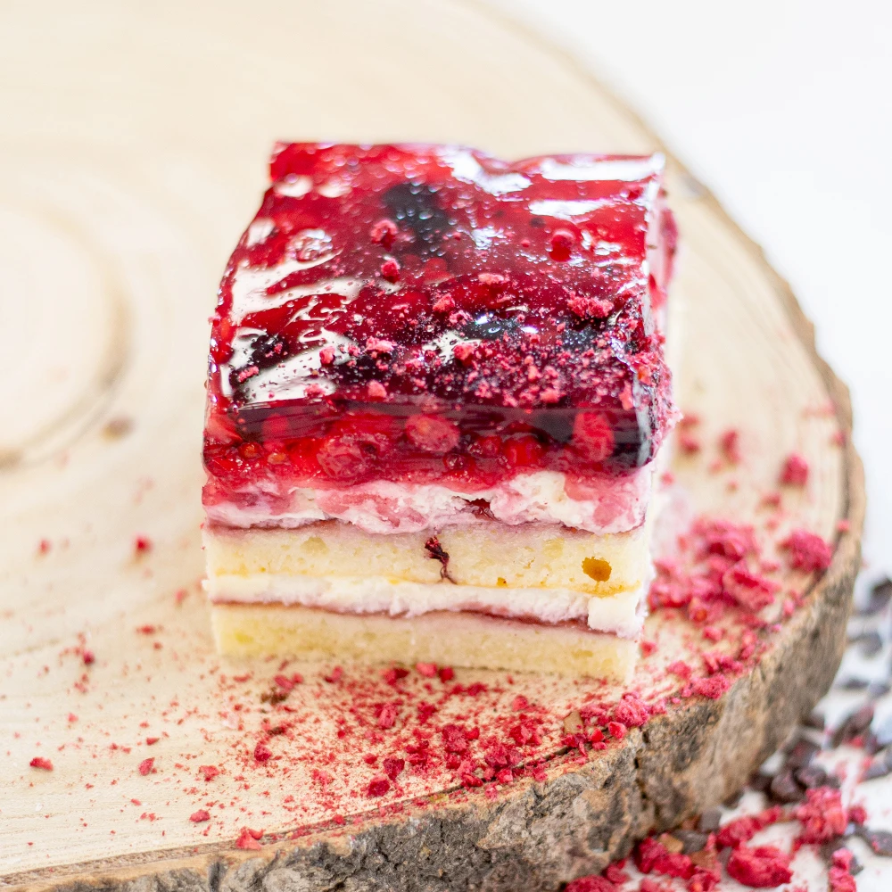 Jogurtová kostka - sametový vanilkový korpus, jemný smetanové jogurtový krém, který se setkává s lesním ovocem, které jsou nejen svěží, ale jejich společná chuť je naprostá fantazie. Celému zákusku dodává dokonalý vzhled želatinový přeliv.