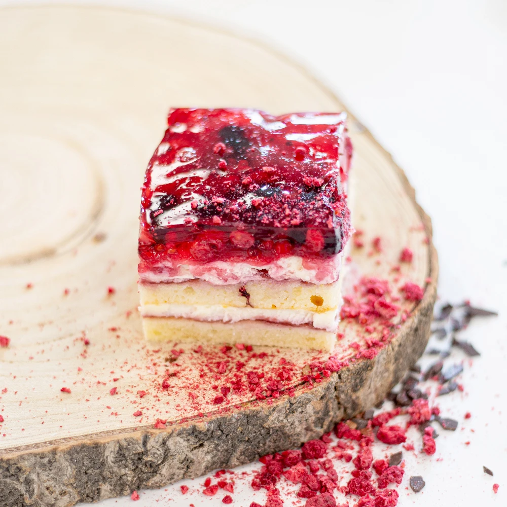 Mini Jogurtová kostka - sametový vanilkový korpus, jemný smetanové jogurtový krém, který se setkává s lesním ovocem, které jsou nejen svěží, ale jejich společná chuť je naprostá fantazie. Celému zákusku dodává dokonalý vzhled želatinový přeliv.