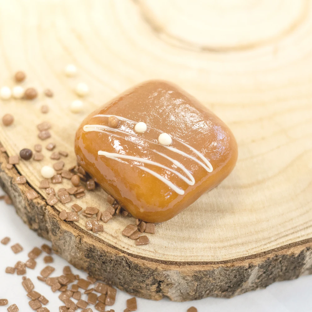 Karamelový kámen - hedvábně jemný karamelový mousse z prémiové bílé čokolády. Sametová textura, která rozpouští a uvolňuje bohatou, krémovou chuť nejvyšší kvality. V srdci každého kousku se skrývá překvapivé tajemství – intenzivní a svěží karamel. Tento dokonalý kontrast mezi sladkou krémovostí bílé čokolády a chutí karamelu vytváří skvělouharmonii. Karamelová zrcadlová poleva nejen chrání jemný mousse, ale také vytváří nezapomenutelný vizuální dojem každého našeho dezertu.