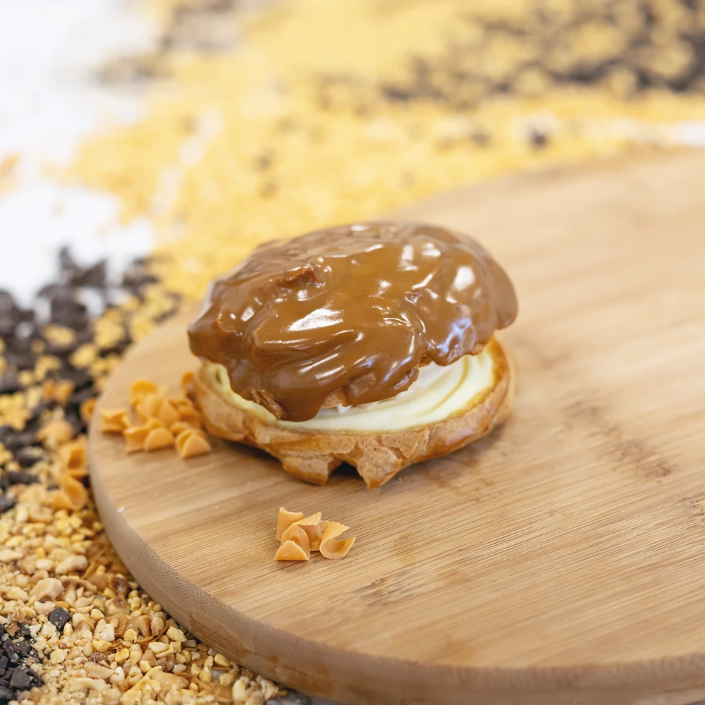 Mini Karamelový větrník - Nadýchané odpalované těsto, které se rozpadá v ústech, s hedvábnou domácí šlehačkou a bohatým karamelovým krémem. Klobouček našeho nejprodávanějšího dezertu je chuť tekutého zlata – karamelová vrstva, která se rozplývá na jazyku.