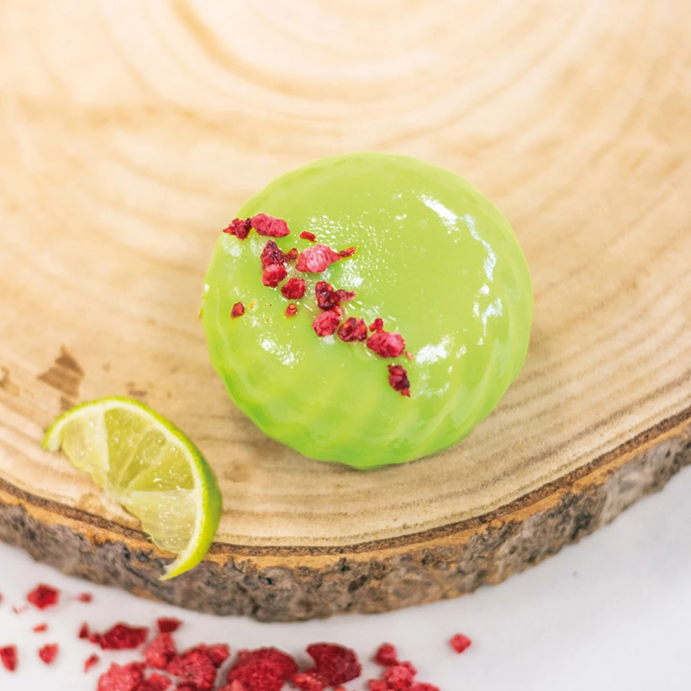 Limetka - hedvábně jemný limetkový mousse z prémiové bílé čokolády. Sametová textura, která rozpouští a uvolňuje bohatou, krémovou chuť nejvyšší kvality. V srdci každého kousku se skrývá překvapivé tajemství – intenzivní a svěžíjahodové pyré. Tento dokonalý kontrast mezi sladkokyselou krémovostí bílé čokolády s limetkou a chutí jahod vytváří skvělou harmonii. Zrcadlová poleva nejen chrání jemný mousse, ale také vytváří nezapomenutelný vizuální dojem každého našeho dezertu.