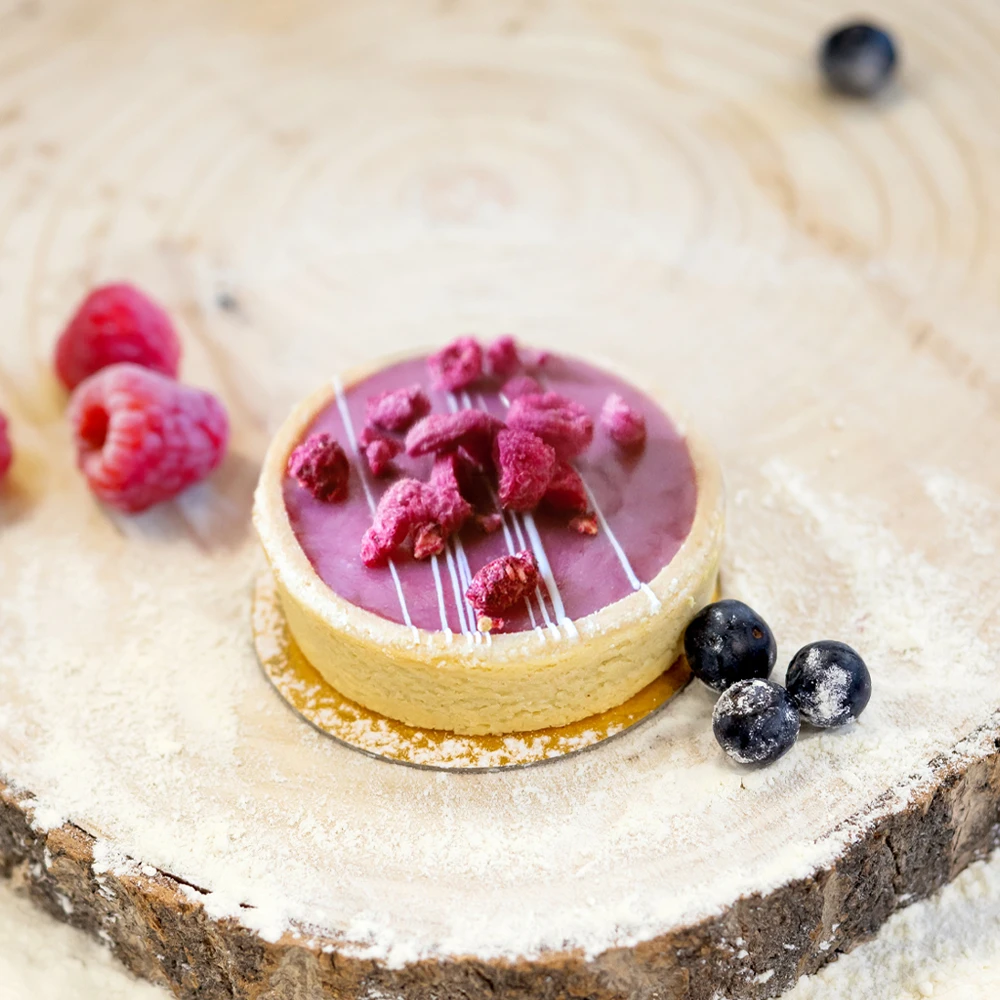 Malinová tartaletka – naše ručně vyráběný křehký korpus z lineckého těsta, který je plněný malinovým gelem, zalitý domácí malinovou ganache a zdobený prémiovou bílou čokoládou s kousky lyofilizových malin.