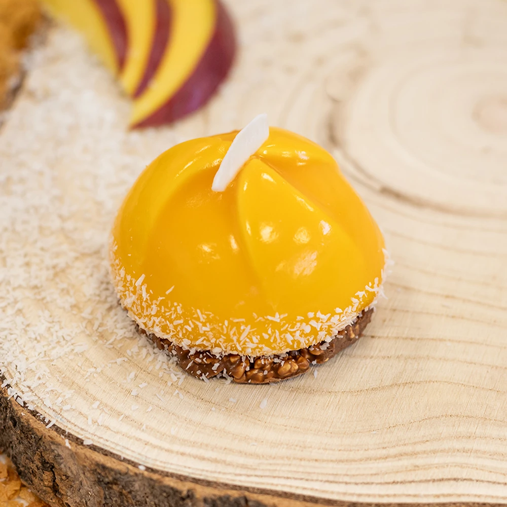 Mango - hedvábně jemný mousse z prémiové bílé čokolády se zakysanou smetanou. Sametová textura, která rozpouští a uvolňuje bohatou, krémovou chuť nejvyšší kvality. V srdci každého kousku se skrývá překvapivé tajemství – intenzivní a svěží mangové pyré. Tento dokonalý kontrast mezi sladkou krémovostí bílé čokolády a chutí manga vytváří skvělouharmonii. Nesmí chybět ani kokosový závoj, který je pro mango nepostradatelným dílkem. Zrcadlová poleva nejen chrání jemný mousse, ale také vytváří nezapomenutelný vizuální dojem každého našeho dezertu. Jako tečkou pro dokonalost je naše domácí ručně vyráběná čokoládová sušenka s drcenými bisquity a burizony.