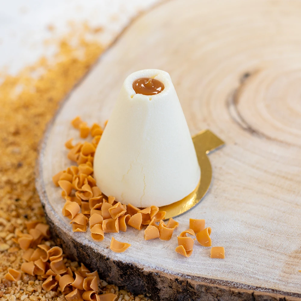 Mini Karamelová špička - hedvábně jemný mousse z prémiové bílé čokolády. Sametová textura, která rozpouští a uvolňuje bohatou, krémovou chuť nejvyšší kvality. V srdci každého kousku se skrývá překvapivé tajemství - intenzivní a svěží karamel. Tento dokonalý kontrast mezi sladkou krémovostí bílé čokolády a chutí karamelu vytváří skvělou harmonii. Dokonalému vzhledu dodává křupavý povlak z bílé čokolády.