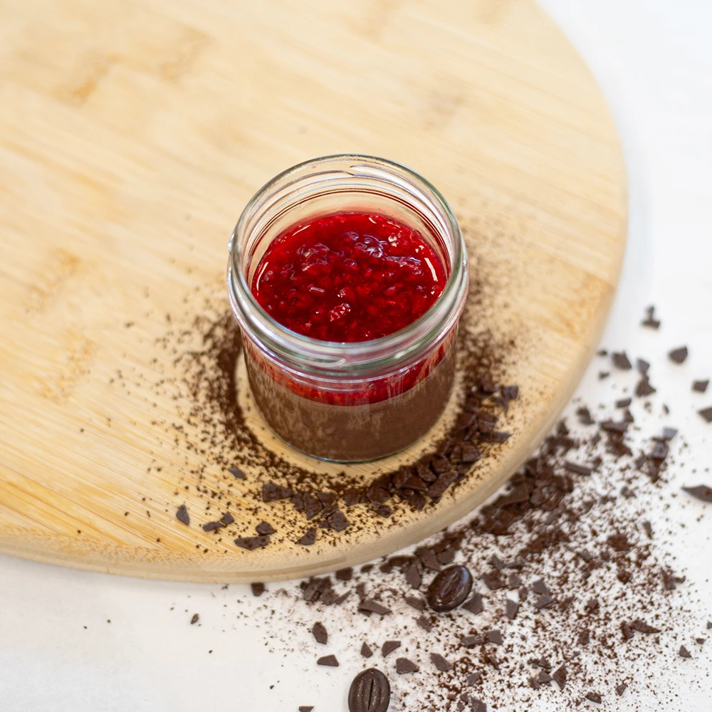 Mini Panna Cotta - hedvábně hladký smetanový dezert s čokoládou, který se jemně rozplývá na jazyku se osvěžujícími želírovanými malinami, které praskají svěžestí a dodávají dokonalý kontrast k bohaté krémovosti.