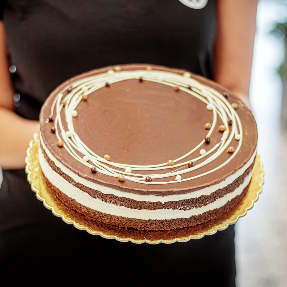 Náš Míša dort kombinuje bohatý kakaový korpus s jemným krémem z mascarpone a tvarohu. Každý kousek je zalitý prémiovou horkou čokoládou a elegantně dozdoben bílou čokoládou s křupavými čokoládovými kuličkami.