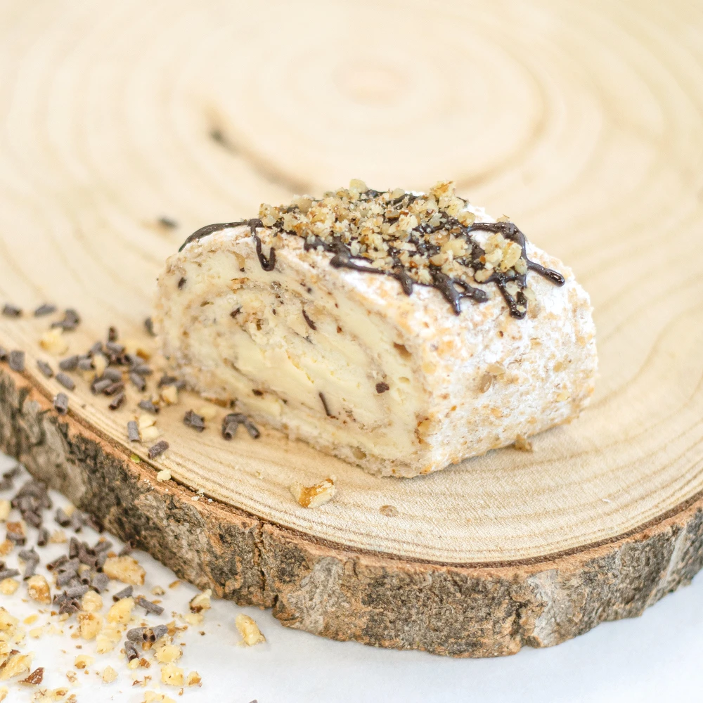 Ořechová roláda - vláčný oříškový piškot s bohatým mascarpone krémem s jemnou šlehačkou a kousky prémiové čokolády vytváří dokonalou harmonii chutí. Čerstvé drcené oříšky dodávají intenzivní chuť, zatímco italské mascarpone zaručuje hedvábnou krémovitost, kterou si zamilujete na první ochutnání.