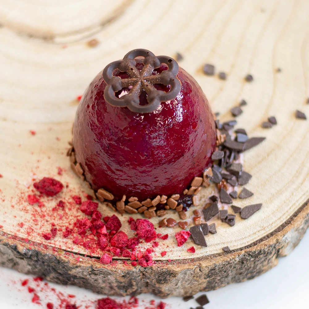 Rybíz - hedvábně jemný rybízový mousse z prémiové bílé čokolády. Sametová textura, která rozpouští a uvolňuje bohatou, krémovou chuť nejvyšší kvality. V srdci každého kousku se skrývá překvapivé tajemství - intenzivní a svěží rybízové pyré. Tento dokonalý kontrast mezi sladkou krémovostí bílé čokolády a chutí kyselého rybízu vytváří skvělou harmonii. Dokonalému vzhledu dodávají čokoládové kostičky a zdobení.