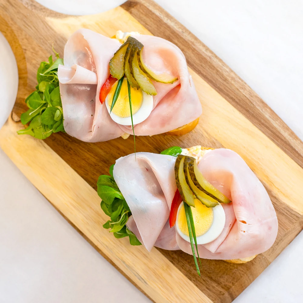 Čerstvá veka s našim domácím bramborovým salátem zdobená polníčkem, obložená plátky vepřové šunky, ozdobená kyselou okurkou, vařeným vejcem a paprikou.