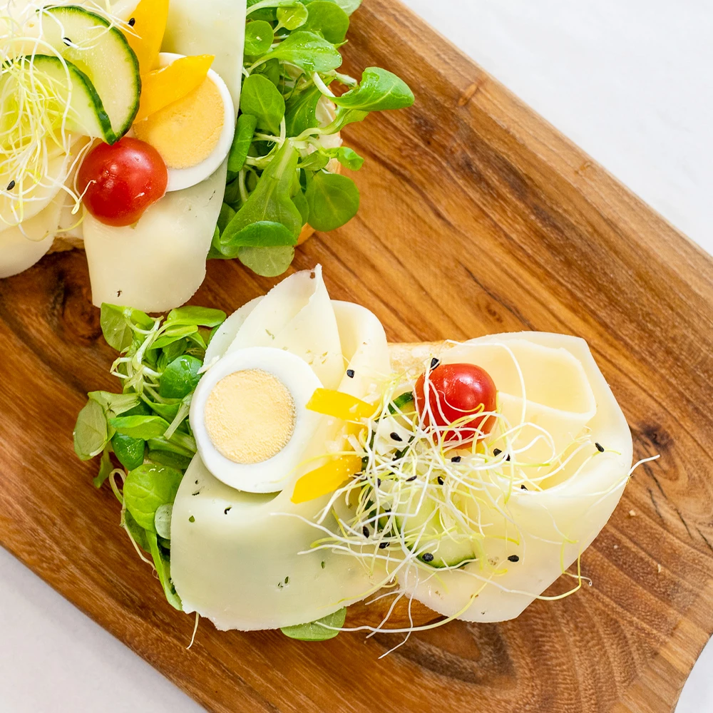 Čerstvá veka na másle zdobená polníčkem, obložená plátky sýra s vařeným vejcem, šťavnatým cherry rajčátkem, okurkou a paprikou.